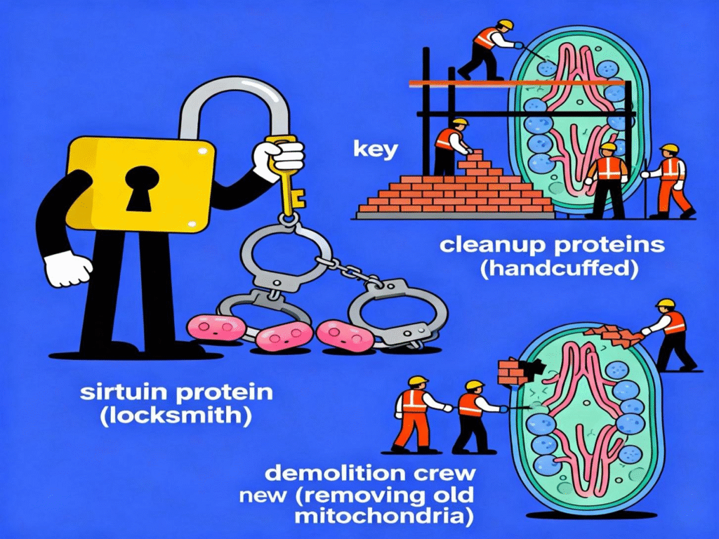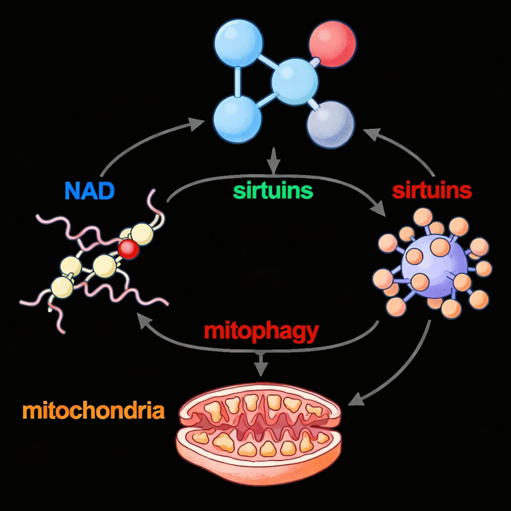 Research shows that as we age, our NAD+ levels—the essential fuel that powers these sirtuin-regulating enzymes—drop significantly. When NAD+ levels are low, the sirtuins cannot perform their functions effectively as molecular locksmiths, resulting in impaired mitophagy efficiency and a potentially hazardous accumulation of damaged mitochondria that should have been removed. This age-related decline in the NAD+/sirtuin system appears to be one of the fundamental reasons why our cells age and our metabolism becomes less efficient over time. The following illustration demonstrates these concepts.