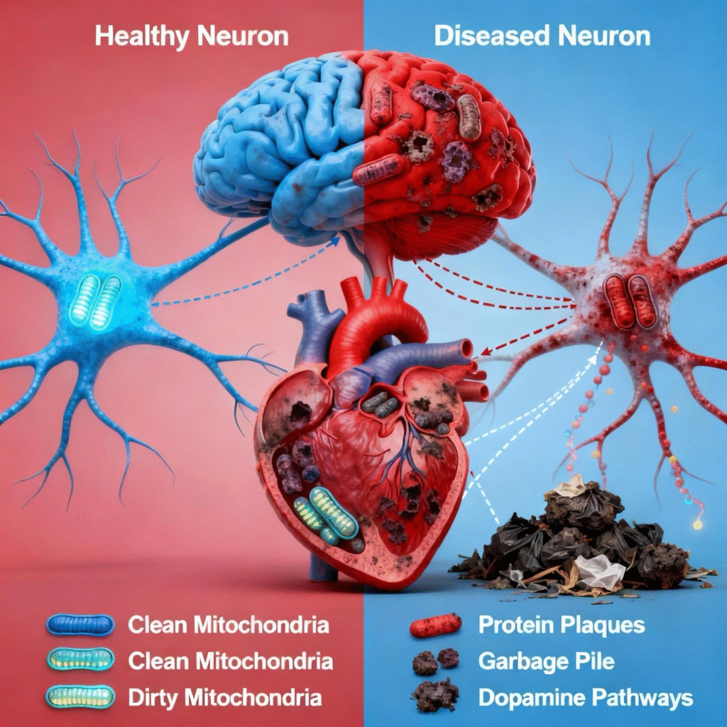 In Parkinson’s disease, genetic mutations damage the PINK1 and Parkin cleanup crews we discussed earlier, leading to a complete breakdown in mitochondrial maintenance within the brain cells that produce dopamine—the chemical messenger responsible for controlling movement. Without proper cleanup, these crucial brain cells become clogged with damaged mitochondria and eventually die, leading to the characteristic tremors and movement problems.