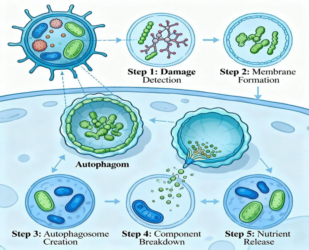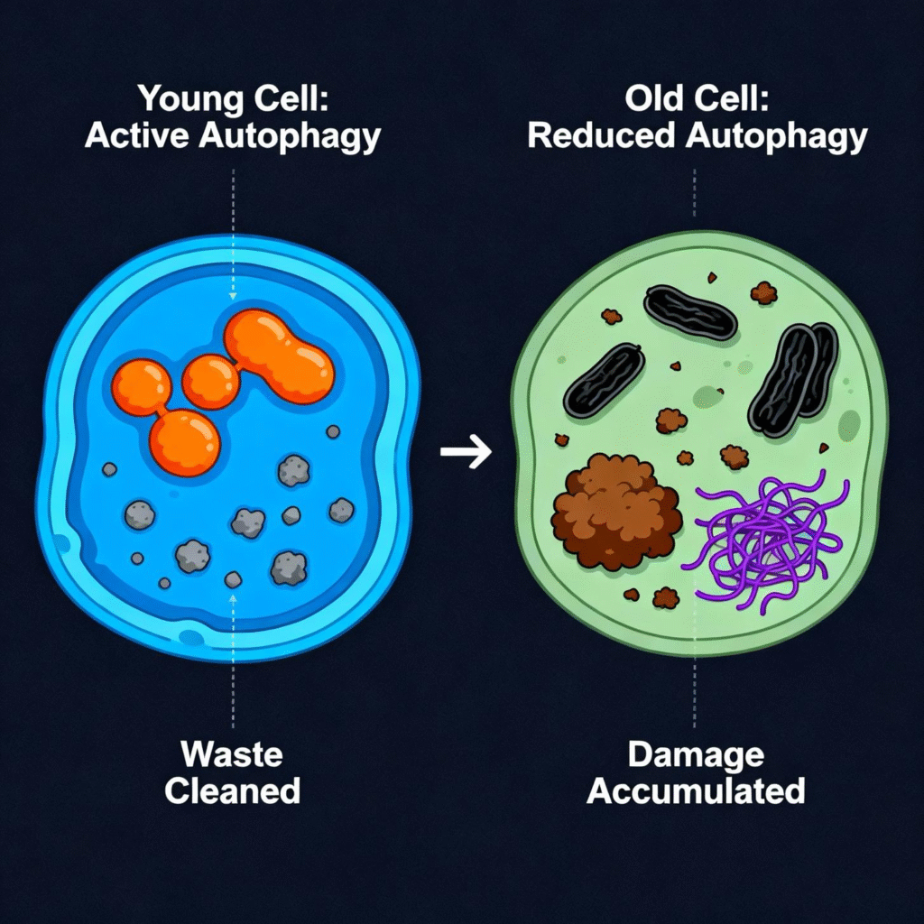 One of the most important discoveries in aging research is that autophagy naturally declines as we get older. In youth, cells are efficient at identifying and removing damaged components. But with age, this quality-control system becomes less active, and “cellular clutter” begins to build up.