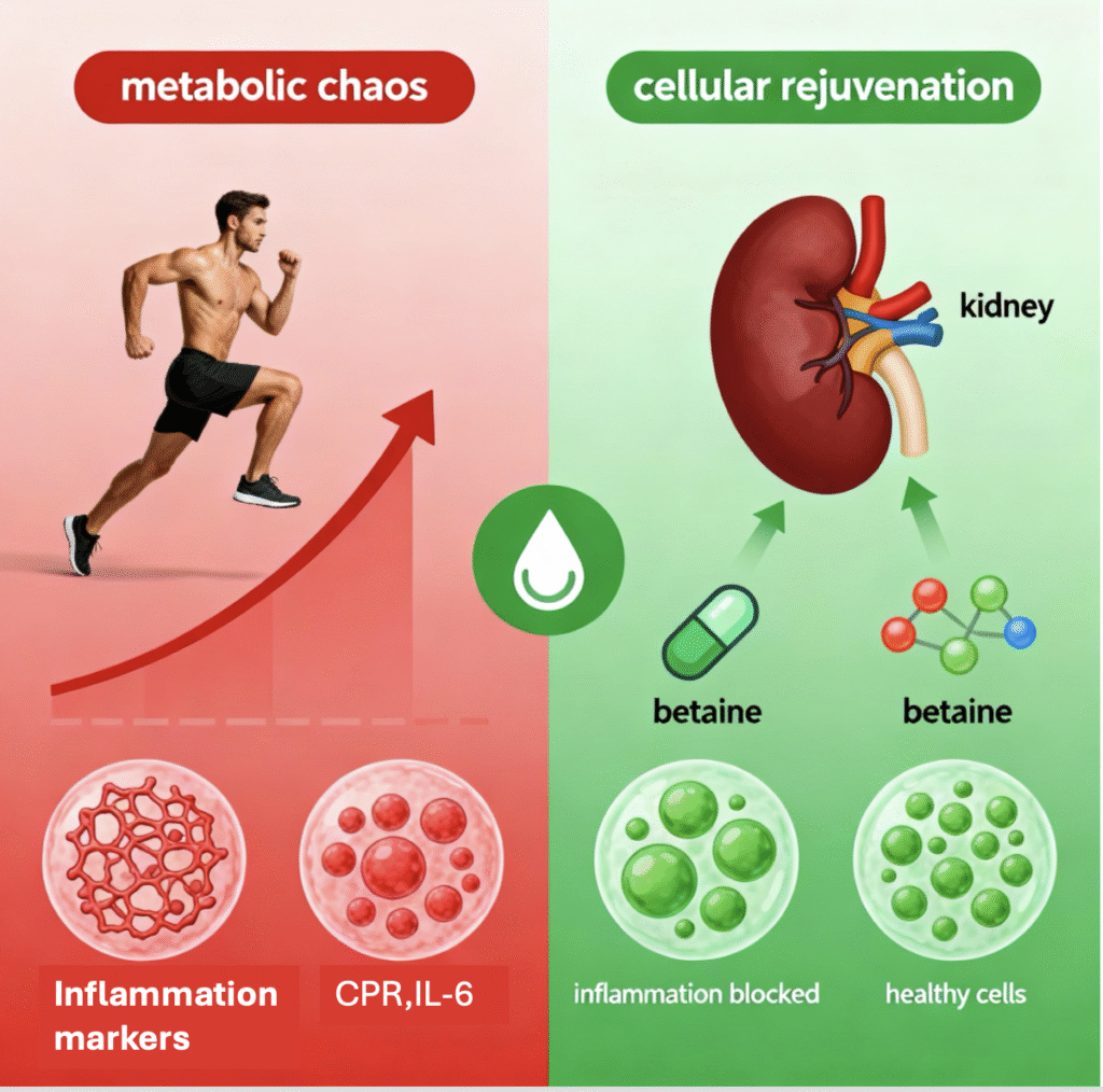 Betaine binds to a protein called TBK1. TBK1 acts like a master switch for inflammation. By blocking TBK1, betaine prevents chronic low grade inflammation, which is one of the major drivers of aging. This explains why one workout is stressful, while consistent workouts are rejuvenating. Regular exercise allows the kidney betaine system to activate and restore balance.