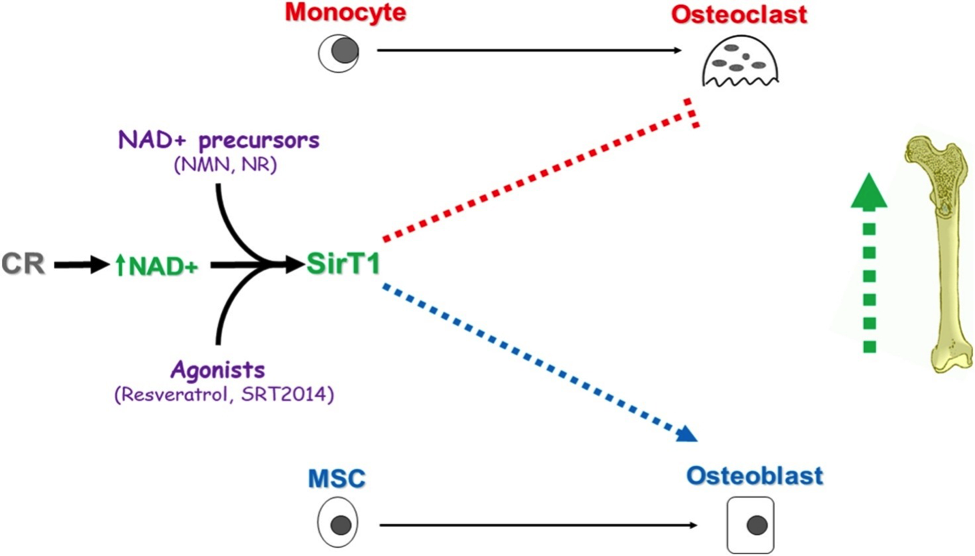 There are other studies which show a distinct relationship between the Sirtuin genes and Osteoporosis. This makes complete sense given the fact that the Sirtuins and Mitochondria are intimately related. WHAT TIES EVERYTHING TOGETHER? NAD! NAD stands for nicotinamide adenine dinucleotide. It is a potent stimulator of the Sirtuin genes especially SirT1. The diagram below is an excellent illustration of this relationship. We want to block the bone eating osteoclasts and encourage the bone building osteoblasts.
